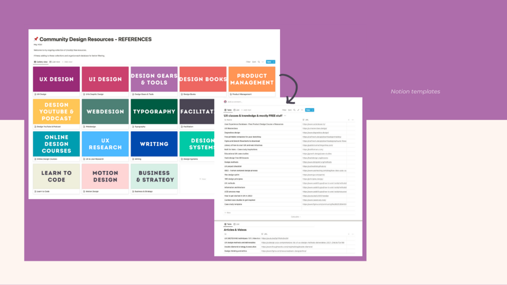 You will receive a pdf ebook and a Reference list with valuable resources that can kickstart your UX design journey (Notion and pdf templates are included).